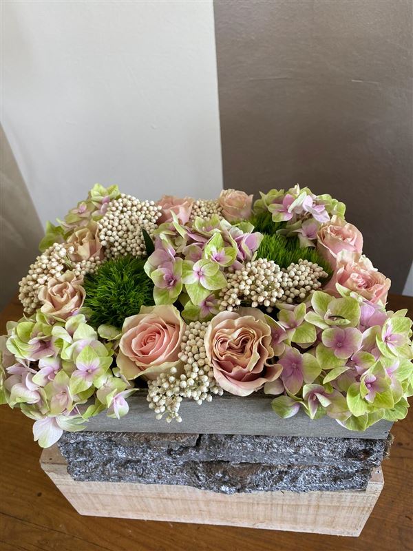 Composizione di fiori in cassetta legno rustica